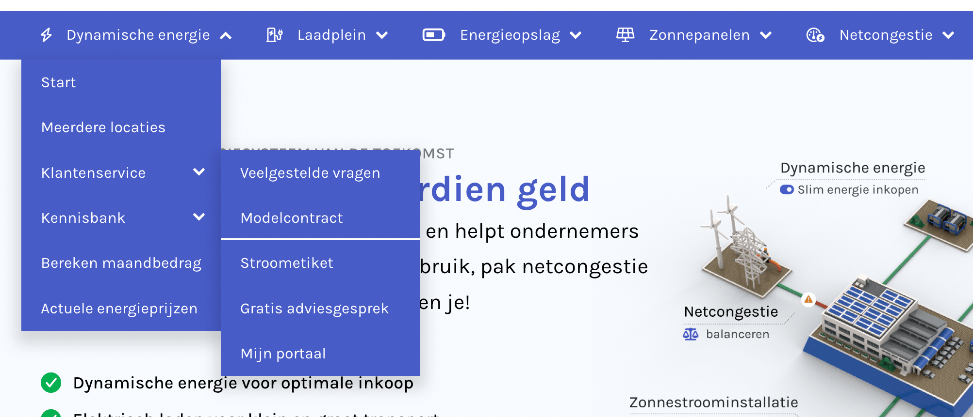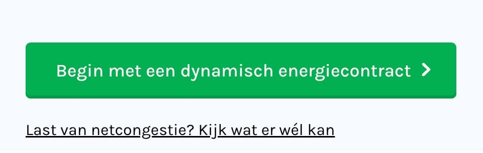 De buttons vallen goed op. Op sommige plaatsen is de tekst (de call to action) vrij lang, zoals "Begin met een dynamisch energiecontract". Als uit de titel of USP-lijst kan blijken wat voor een contract het is, zou de button "Begin nu" kunnen communiceren. Dit is compact, actief en urgent.