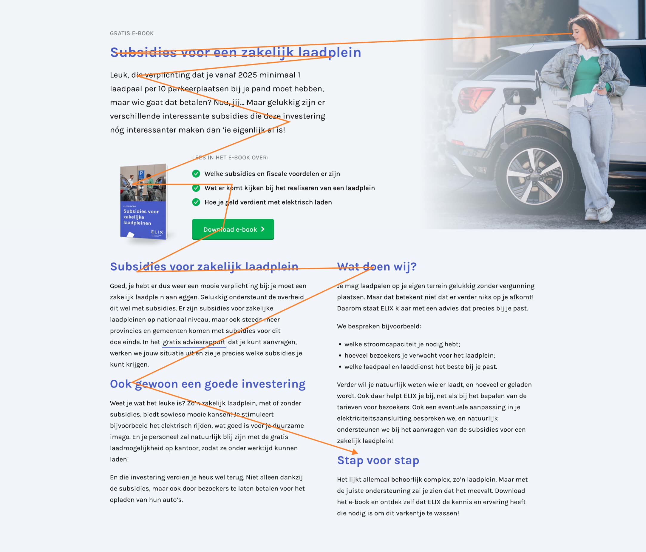 Op de landingspagina "Subsidies voor een zakelijk laadplein" is de layout overweldigend. Onderstaande afbeelding illustreert hoe een bezoeker de pagina kan scannen. Dit is alleen maar een theorie, maar het is belangrijk dat we erover nadenken hoe bezoekers de pagina bekijken.